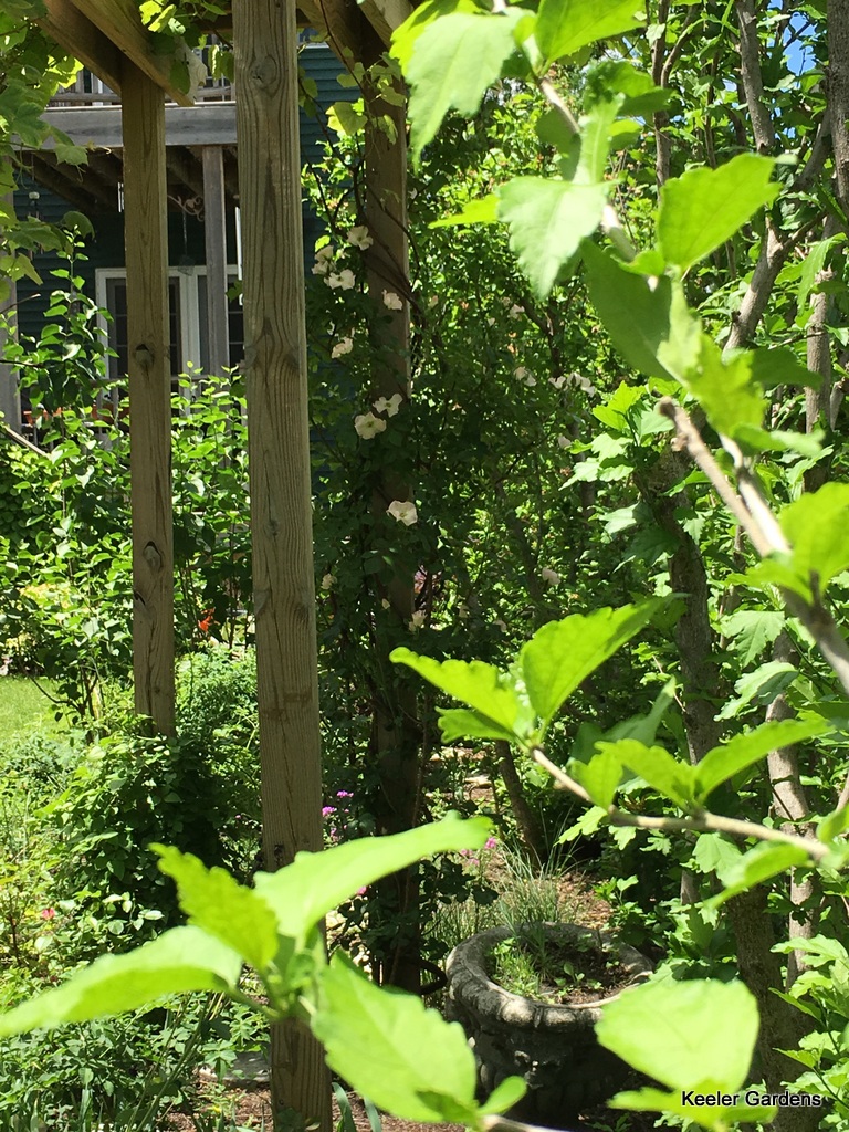 Sunny afternoon looking at the pergola with it's climbing roses, clemetas, and grapes adorning the top. Looking through the rose of Sharon, in the foreground frame the cement container with ornamental grasses at Keeler Gardens.