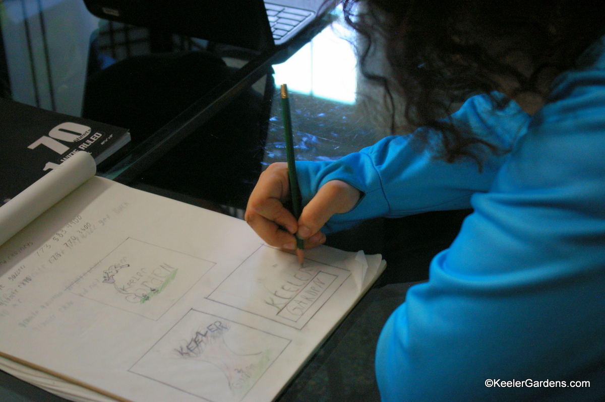 In his blue sweatshirt our art intern takes out a pencil and focuses sketches new ideas for a Keeler Gardens logo. Some of his designs incorporate Keeler Gardens name into nature, like the branches of trees or in a flower bed.